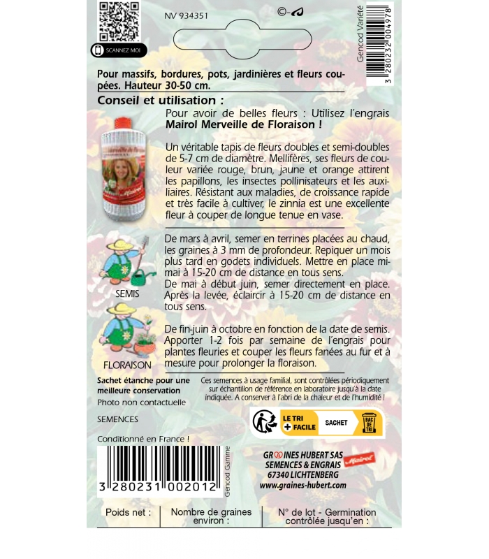Sachet de 1 gramme soit environ 600 graines de Zinnia du Mexique Tapis Persan Double Varié