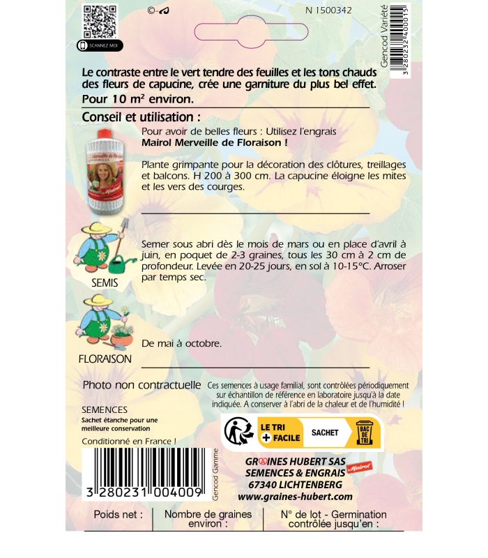 Sachet Format ECO de 12 grammes soit environ 60 graines de Capucine Grimpante variée Pour 10 m2