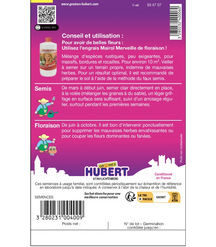 Composé de plusieurs variétés d'annuelles, la diversité de ce mélange permet une floraison prolongée.