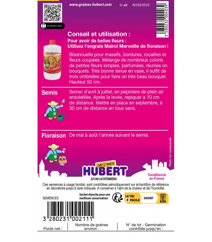 Pour massifs, bordures, rocailles, fleurs coupées, potées. Hauteur 50 cm.