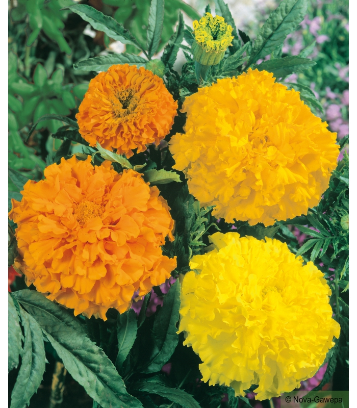 Les fleurs doubles des roses d'Inde de couleur jaune ou orange et d'un diamètre 10-12 cm se renouvellent durant toute la belle saison.