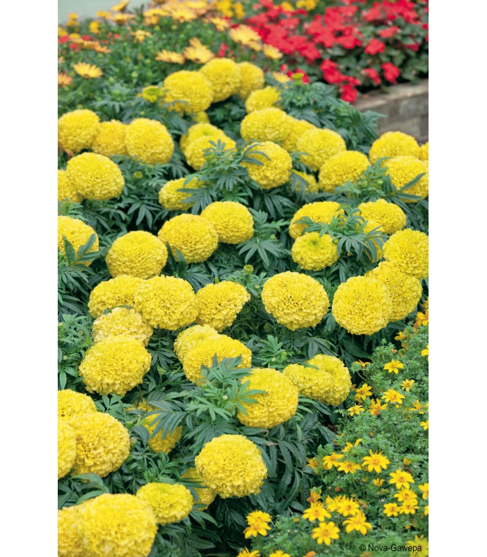 Les fleurs doubles des roses d'Inde de couleur jaune se renouvellent durant toute la belle saison.