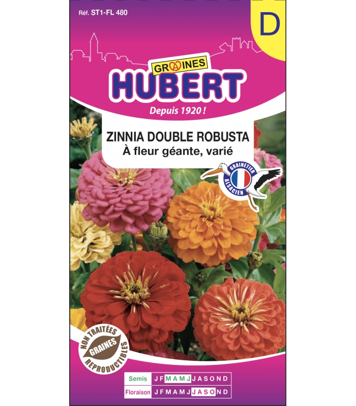 Le zinnia double Robusta à fleur géante varié fleurit de juin à octobre pour les semis de mars et de juillet à octobre pour les semis de mai-juin.