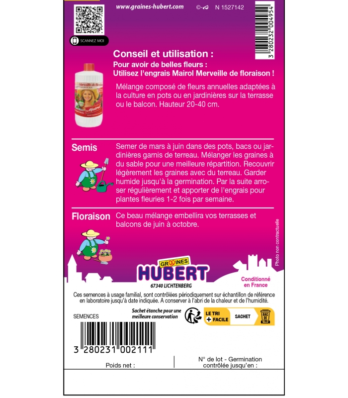 Ce mélange de fleurs annuelles est très fourni, variétés adaptées à la culture en pots, ou en jardinières sur la terrasse ou le balcon !