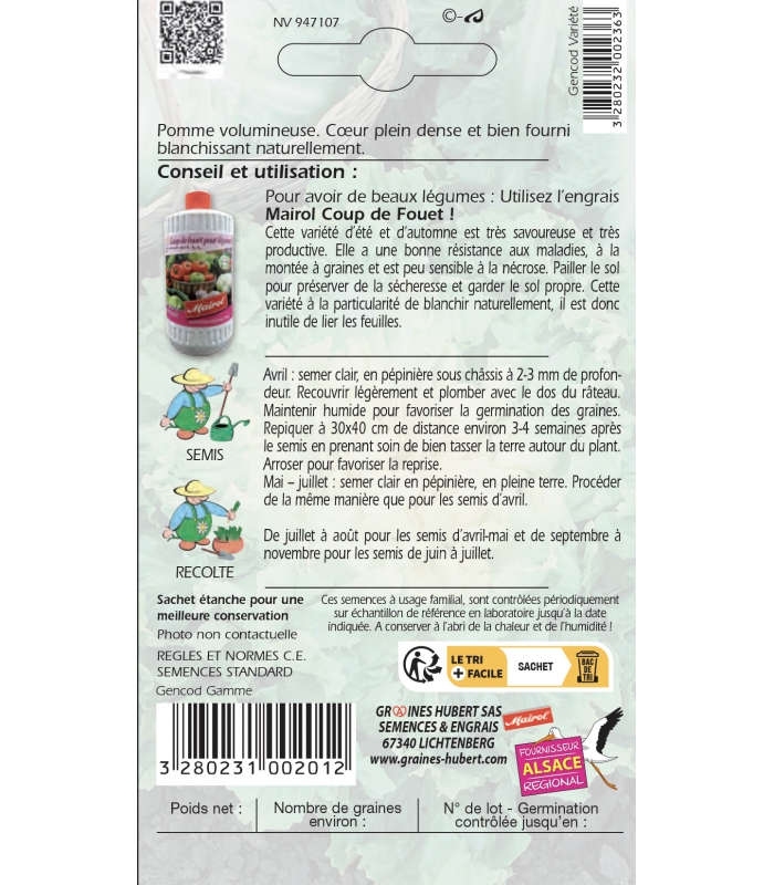 Ces semences à usage familial, sont contrôlées périodiquement sur échantillon de référence en laboratoire jusqu'à la date indiquée sur l'emballage. Conserver à l'abri de la chaleur et de l'humidité.