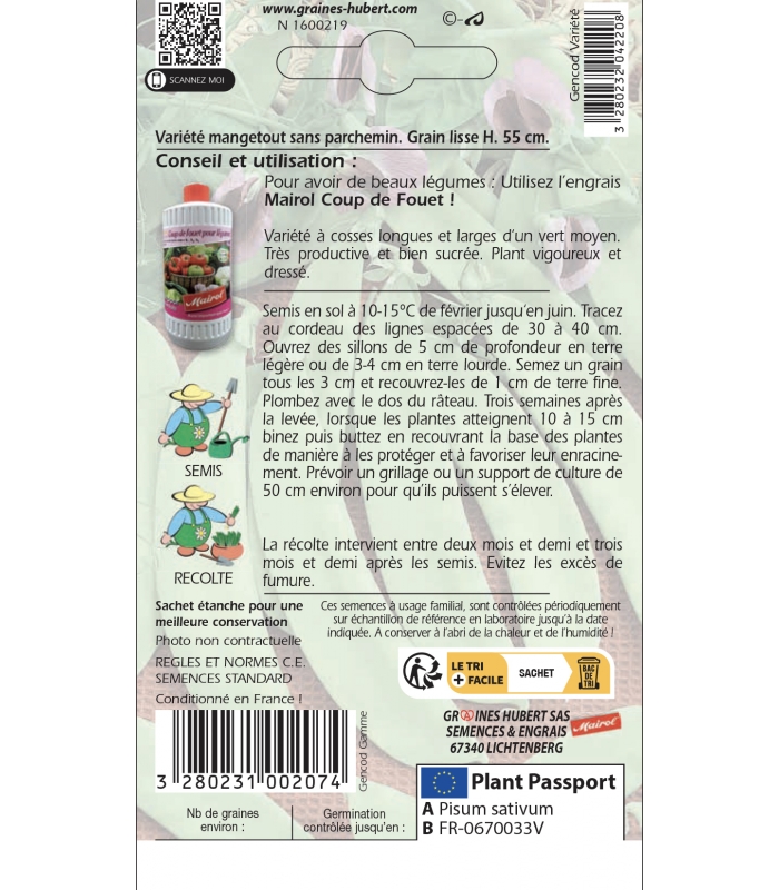Ces semences de pois mangetout Norli à usage familial, sont contrôlées périodiquement sur échantillon de référence en laboratoire jusqu'à la date figurant sur le haut de la boite.