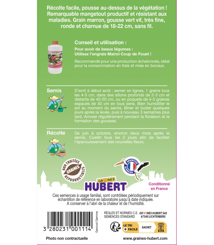 Variété nouvelle à très longues cosses, bien rondes, absolument sans fils, très productive, de culture facile.