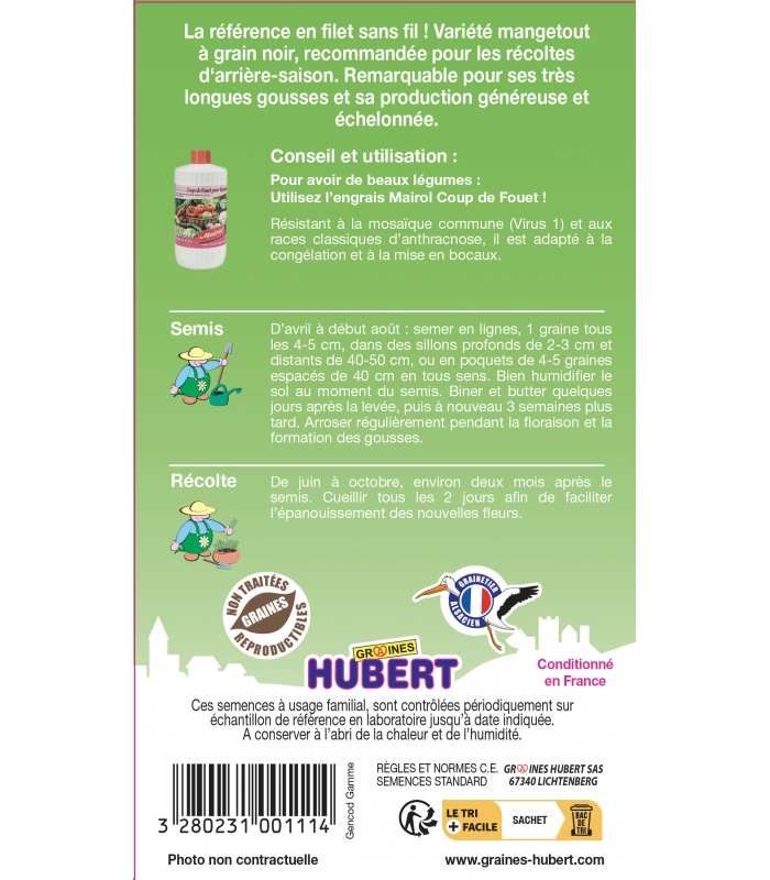 Variété demi-hâtive à rendement élevé, le haricot mangetout nain Delinel se récolte au stade de filet ou au stade mangetout car il supporte sans problème quelques jours d'attente sans prendre de fil.