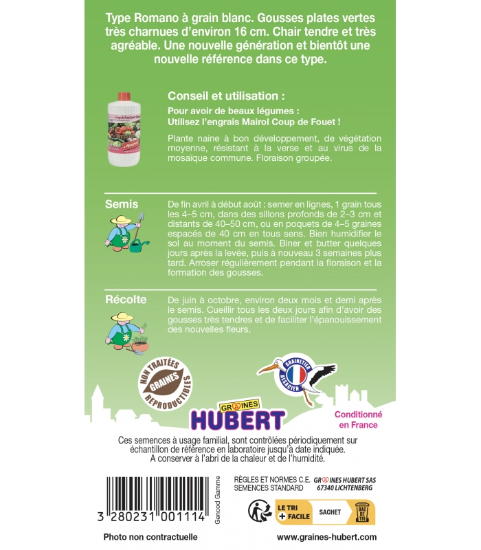 Type Romano, gousses plates vertes très charnues à chair tendre et très agréable.