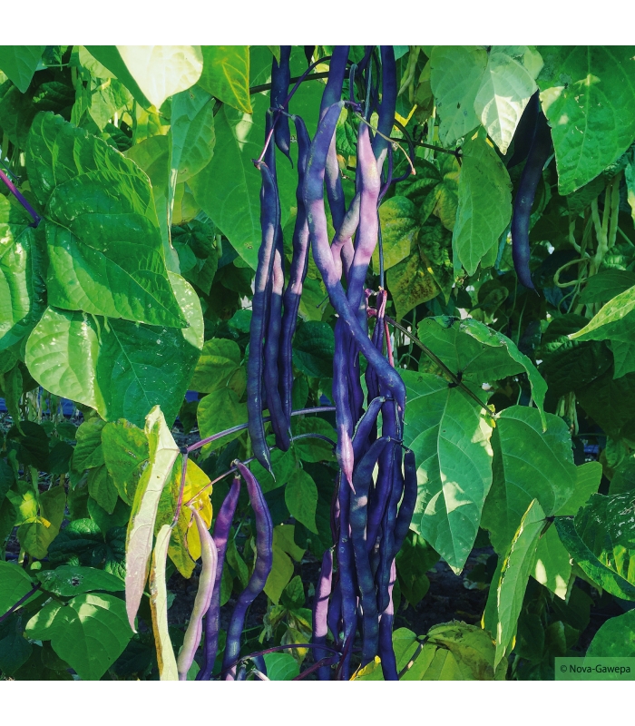 Les gousses du haricot mangetout à rames Blauhilde sont rondes ovales, de couleur bleu-violacé devenant vertes après cuisson.