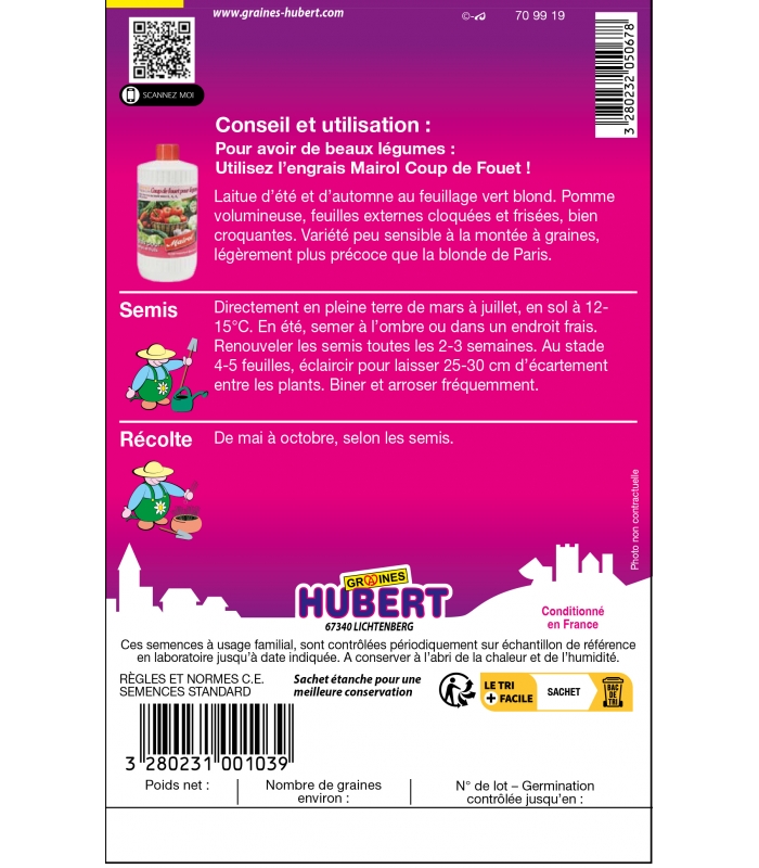Sachet Format ECO de 9 grammes soit environ 8100 graines de Laitue Batavia de Pierre Bénite