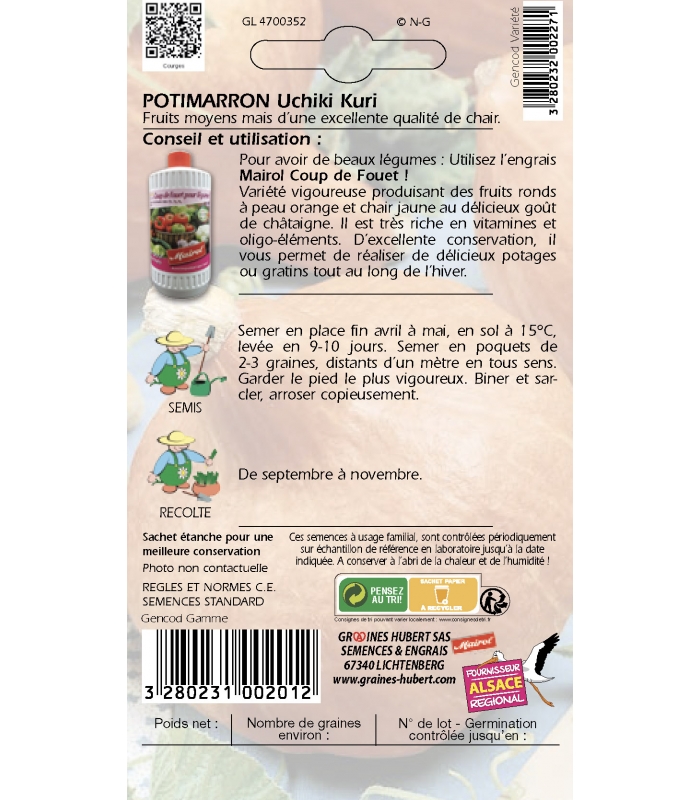 Ces semences de Potimarron Uchiki Kuri à usage familial, sont contrôlées périodiquement sur échantillon de référence en laboratoire jusqu'à la date indiqué sur le sachet.