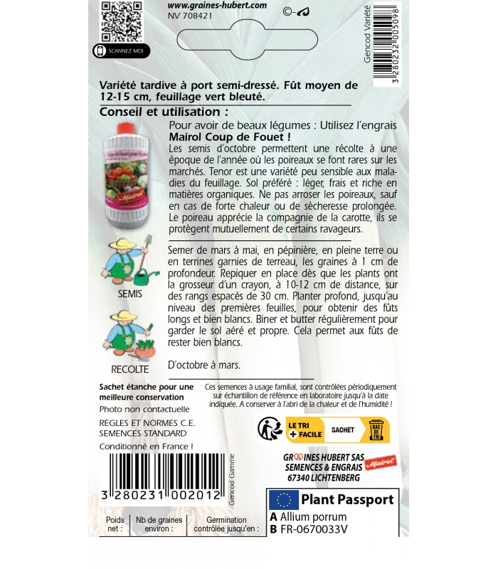 Informations complémentaires sur le Poireau Géant d'Hiver Race Tenor :