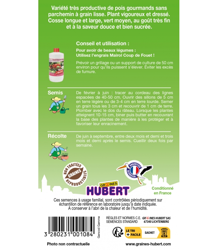 Ces semences de pois mangetout Norli Bio à usage familial, sont contrôlées périodiquement sur échantillon de référence en laboratoire jusqu'à la date figurant sur le haut de la boite.