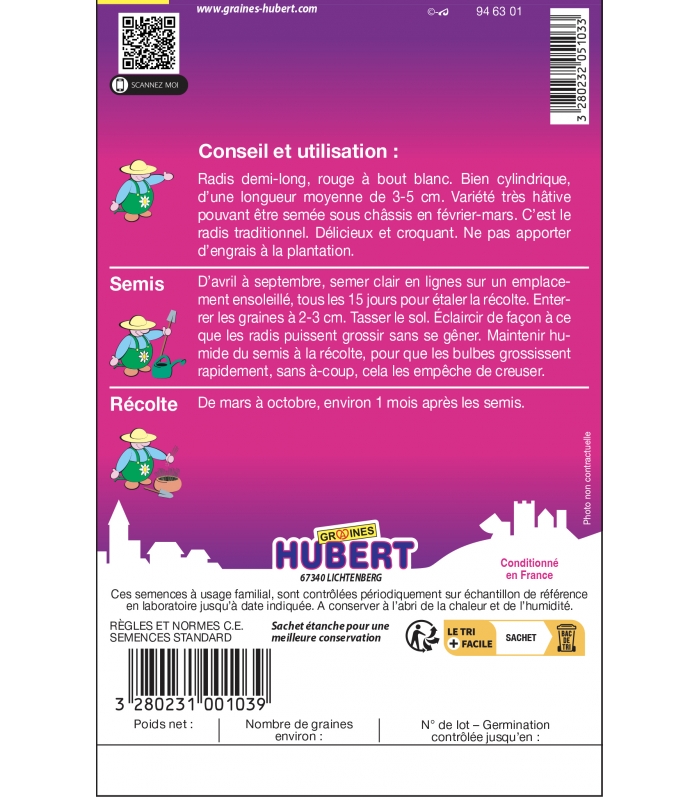 De croissance rapide le radis de 18 jours donne des racines bien cylindriques de 3-5 cm de long, demi-longues, rouges à petit bout blanc très croquantes.