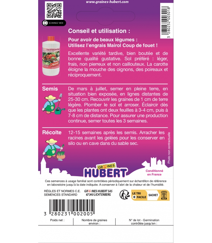 Les semis de carotte Berlicum doivent être éclaircis en deux fois, à 2-3 cm puis à 6-8 cm sur le rang. Recolter les carottes Berlicum à la fourche bêche en y laissant les fanes pour la conservation.