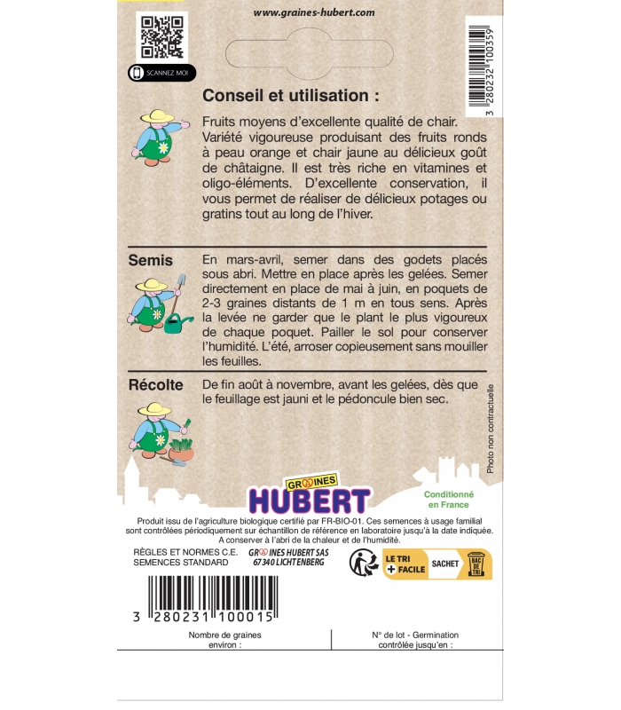 Ces semences de Potimarron Uchiki Kuri à usage familial, sont contrôlées périodiquement sur échantillon de référence en laboratoire jusqu'à la date indiqué sur le sachet.
