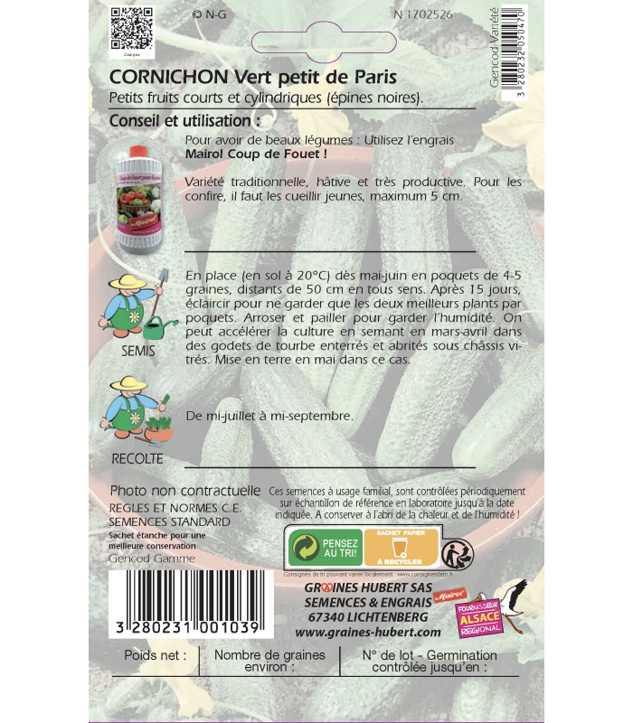 Sachet ECO de 9 grammes soit environ 250 graines de Cornichon vert petit de Paris